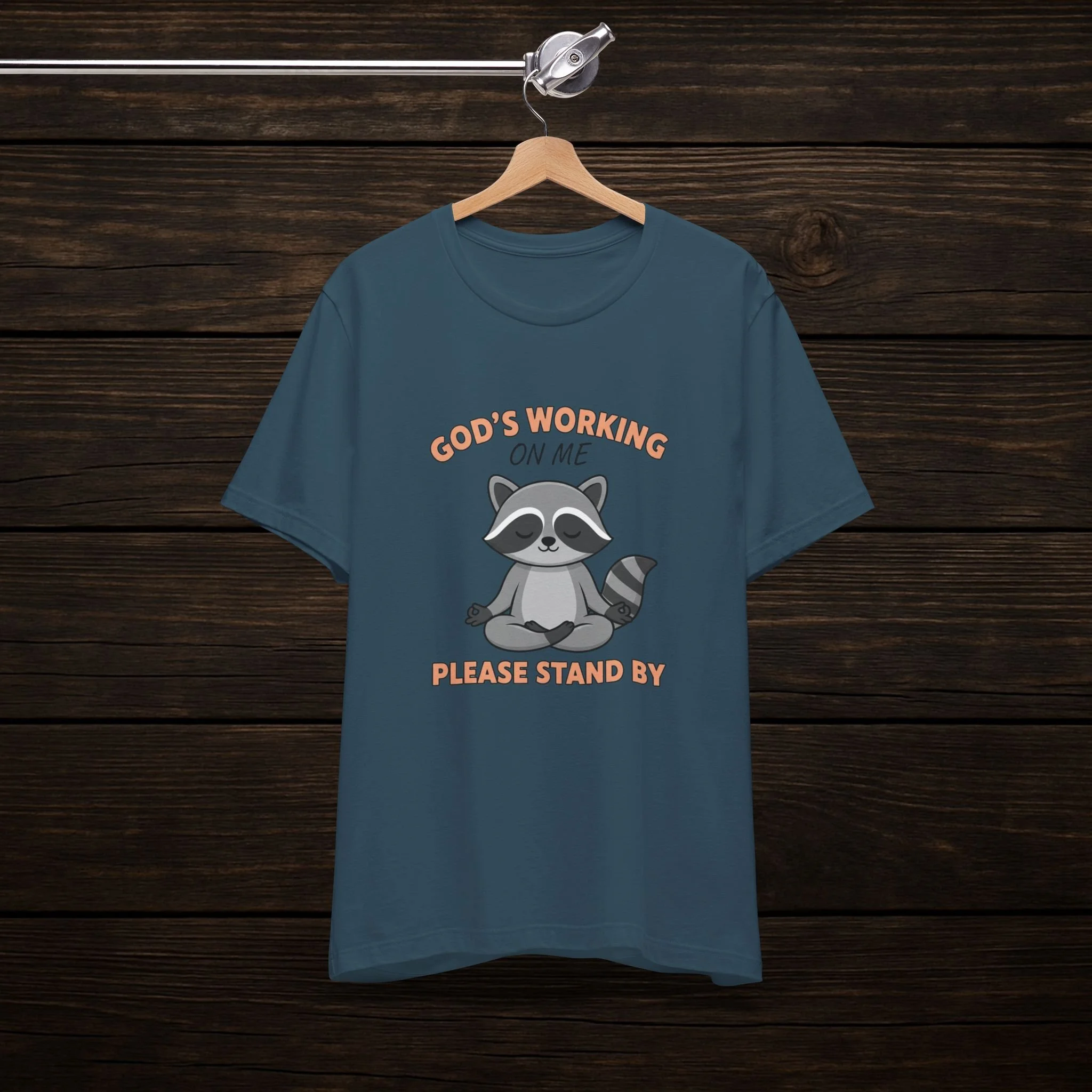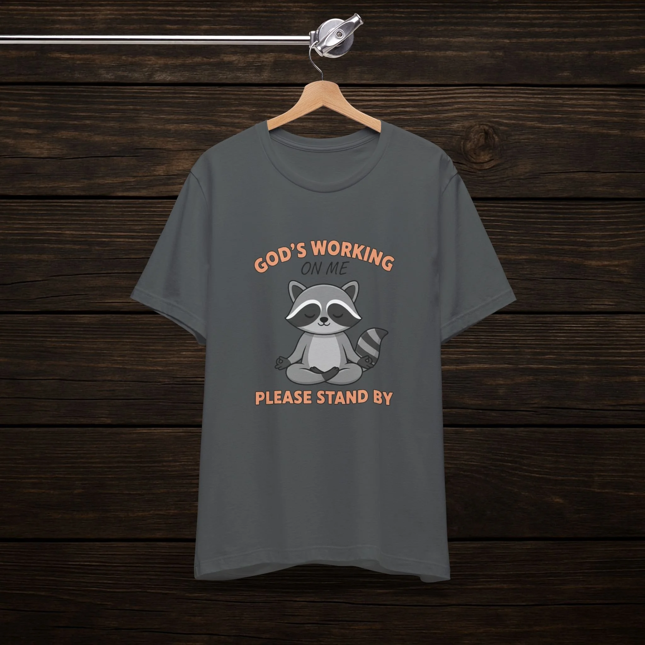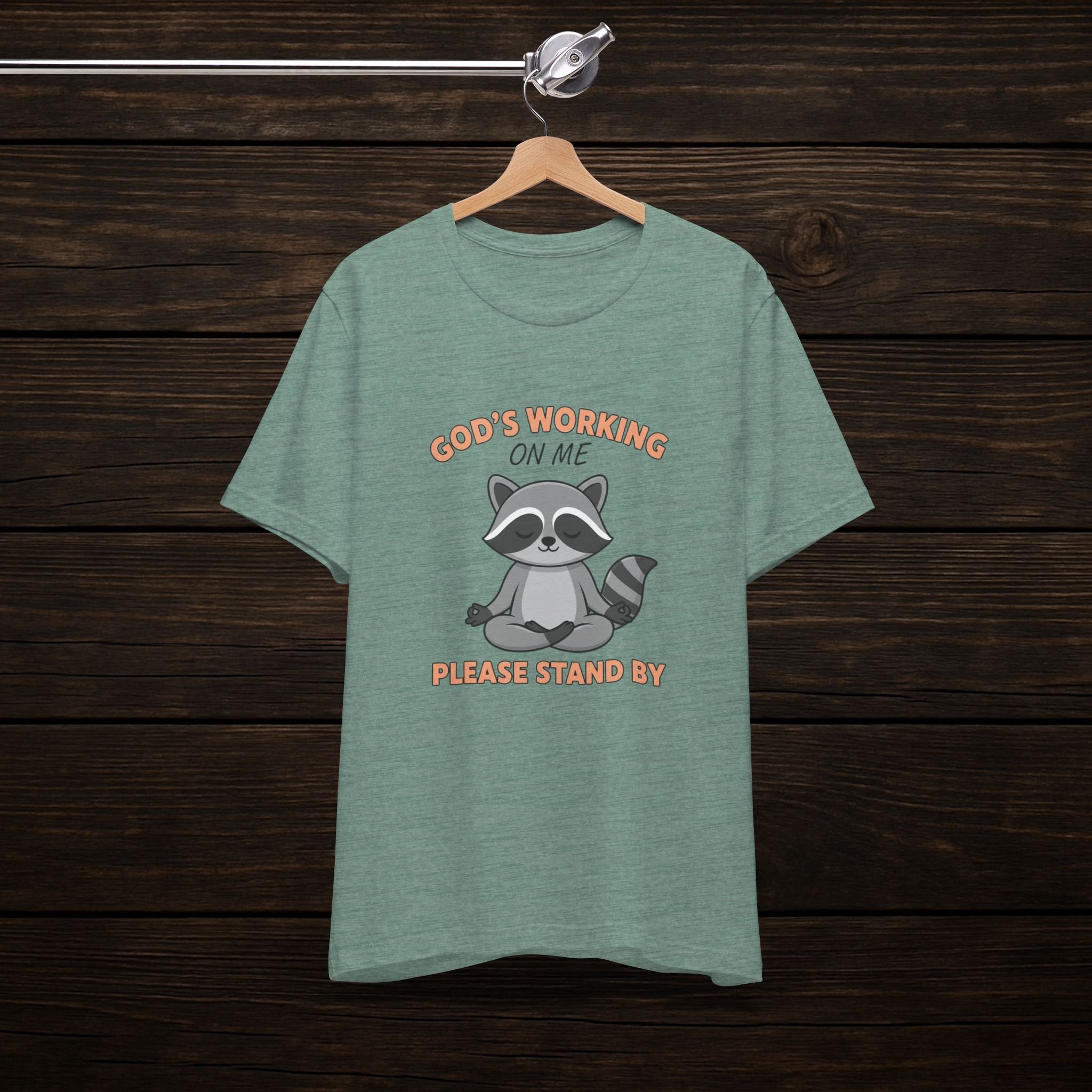 God's Working On Me Please Stand By Raccoon T-Shirt - Cute Faith Graphic Tee