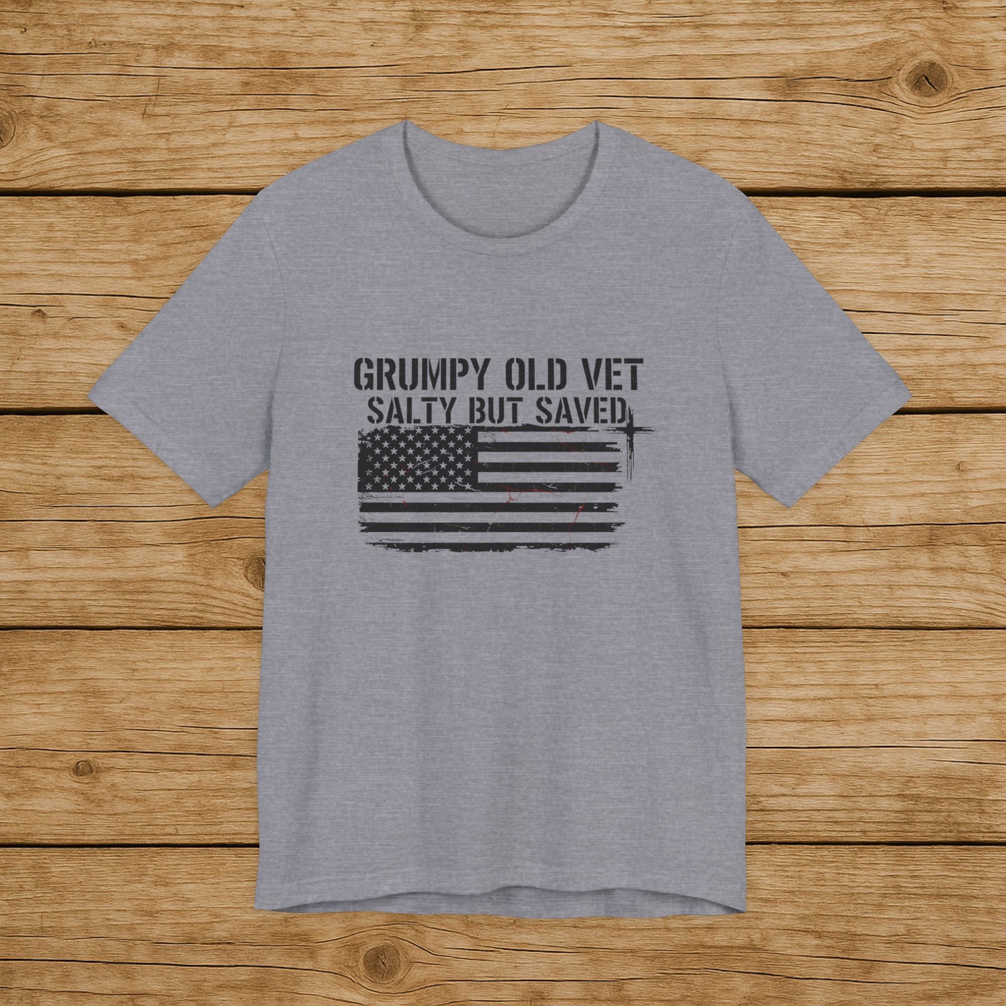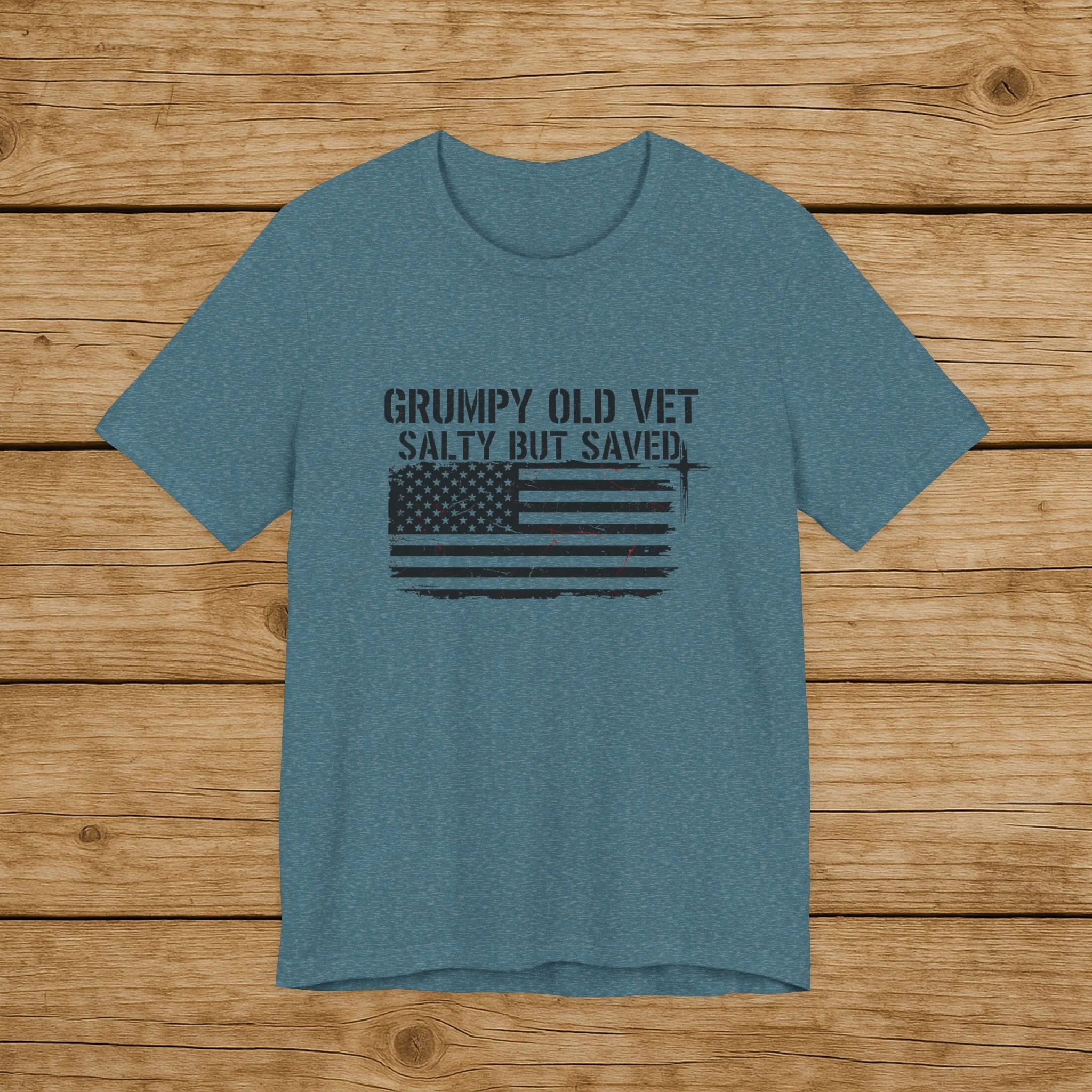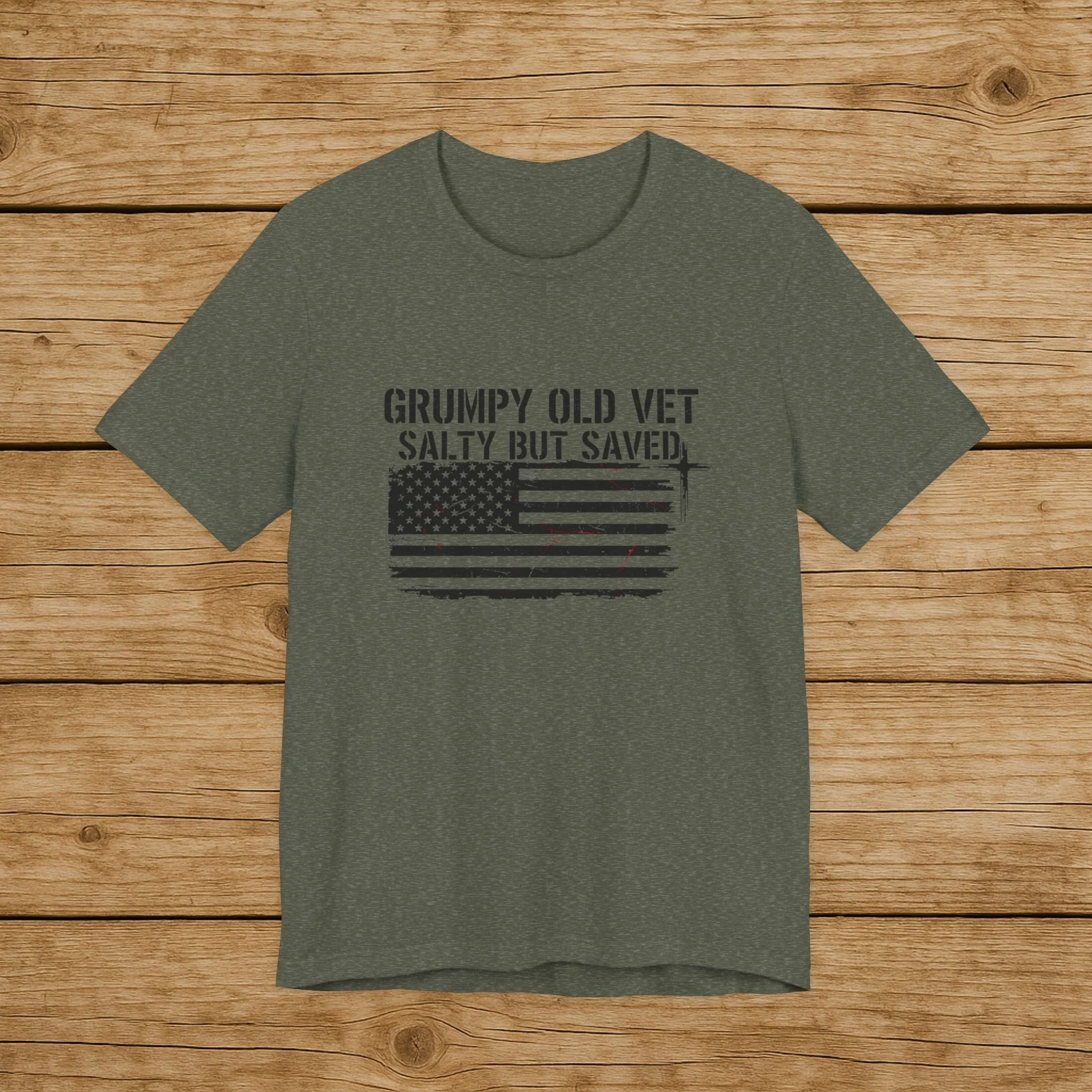 Grumpy Old Vet Shirt • Salty But Saved Veteran Tee • Christian Military Veteran Gift • Patriotic Flag Shirt for Men • Faith & Freedom Tee • Veteran Humor Shirt