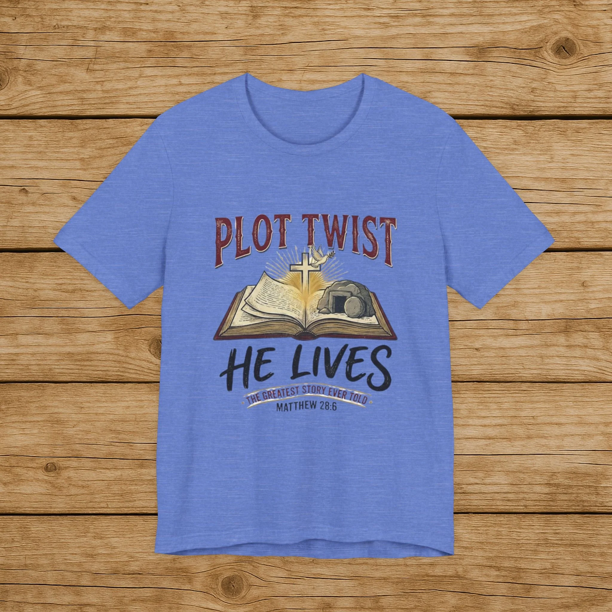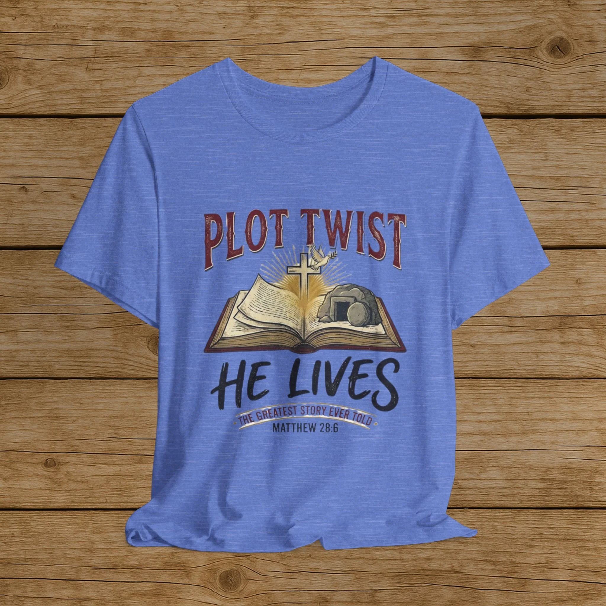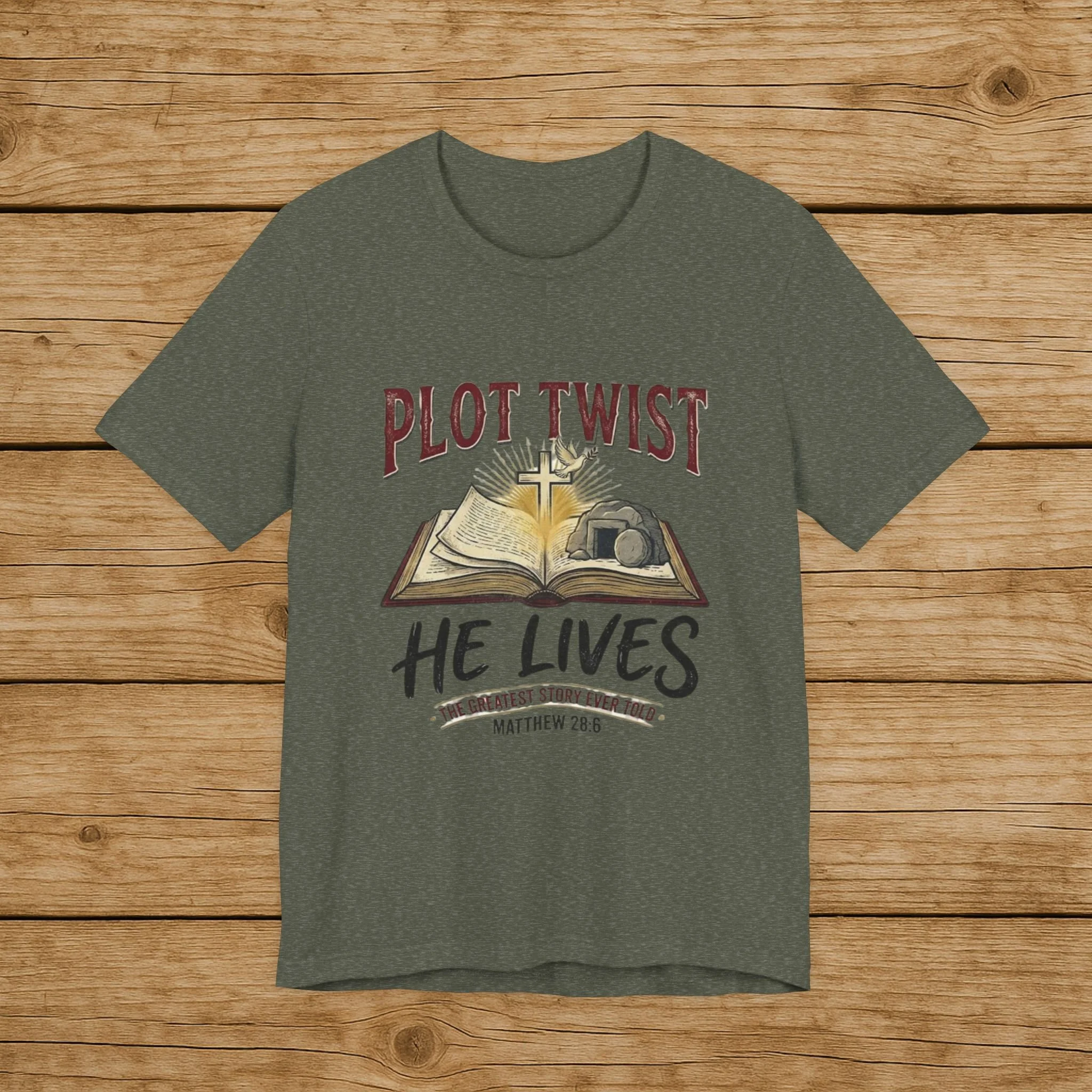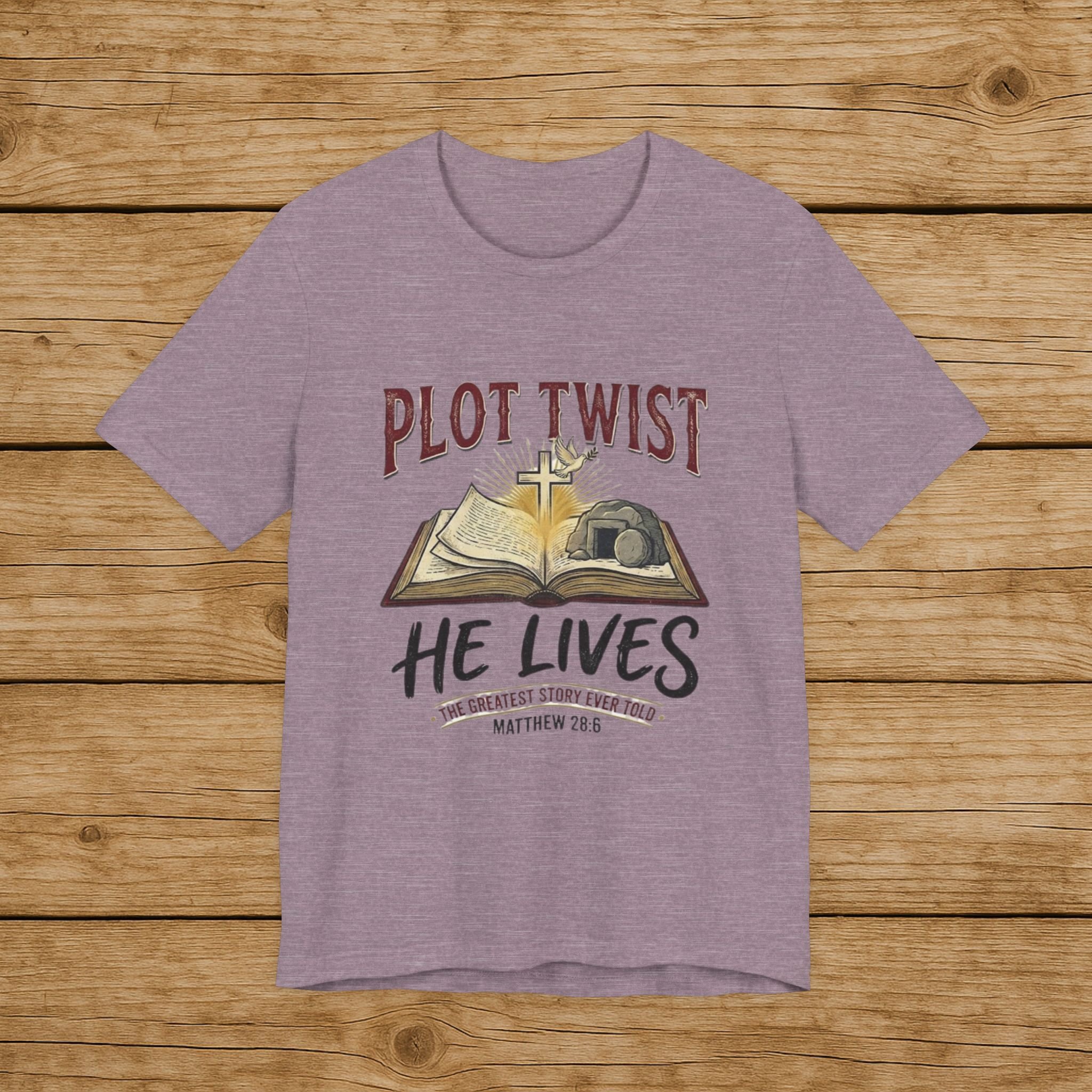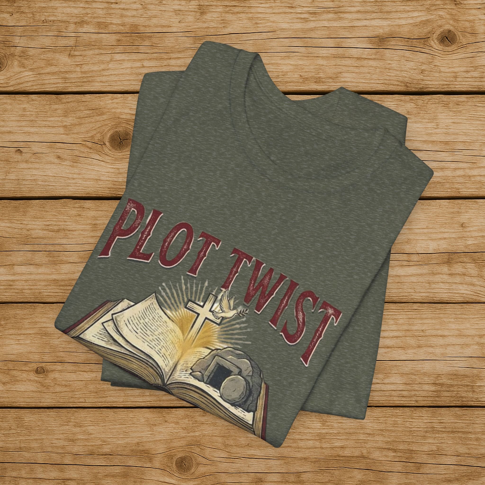 Plot Twist He Lives T-Shirt — Christian Easter Bible Verse Tee (Matthew 28:6)