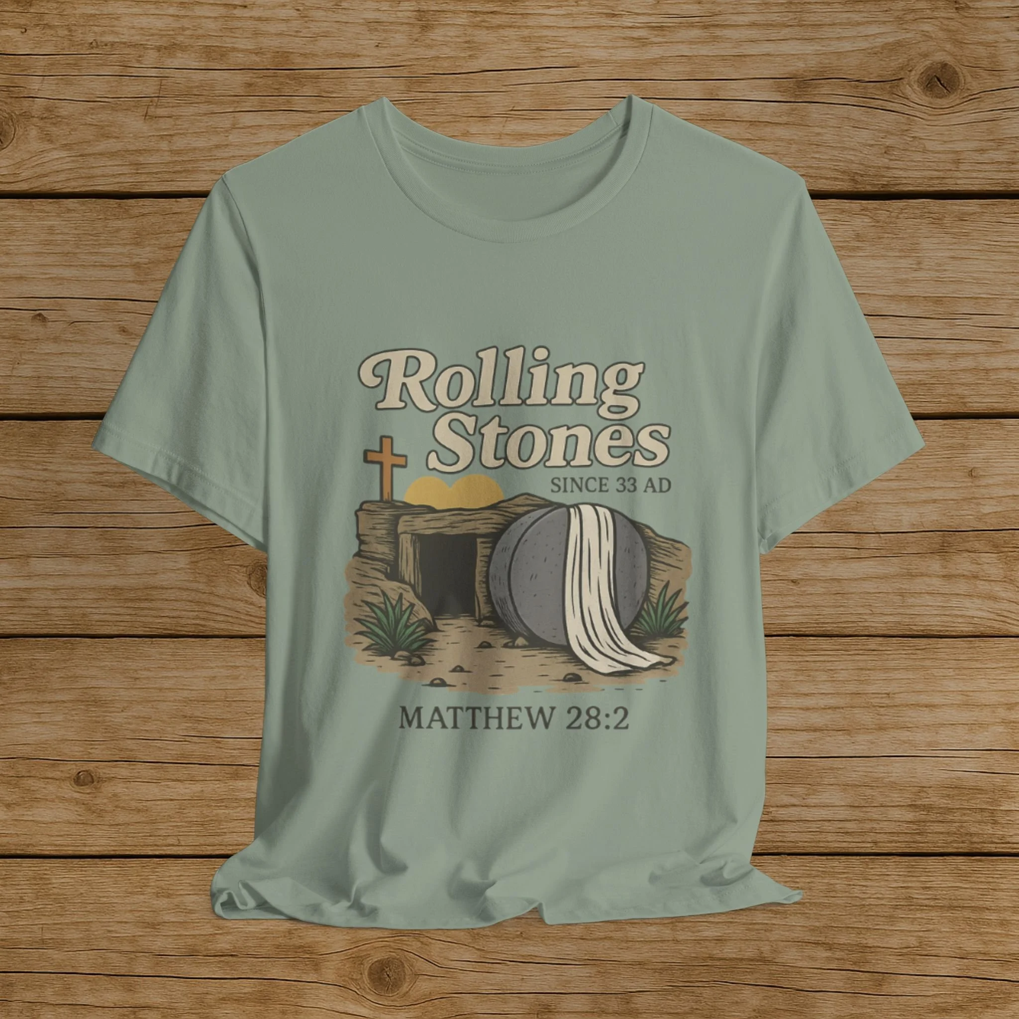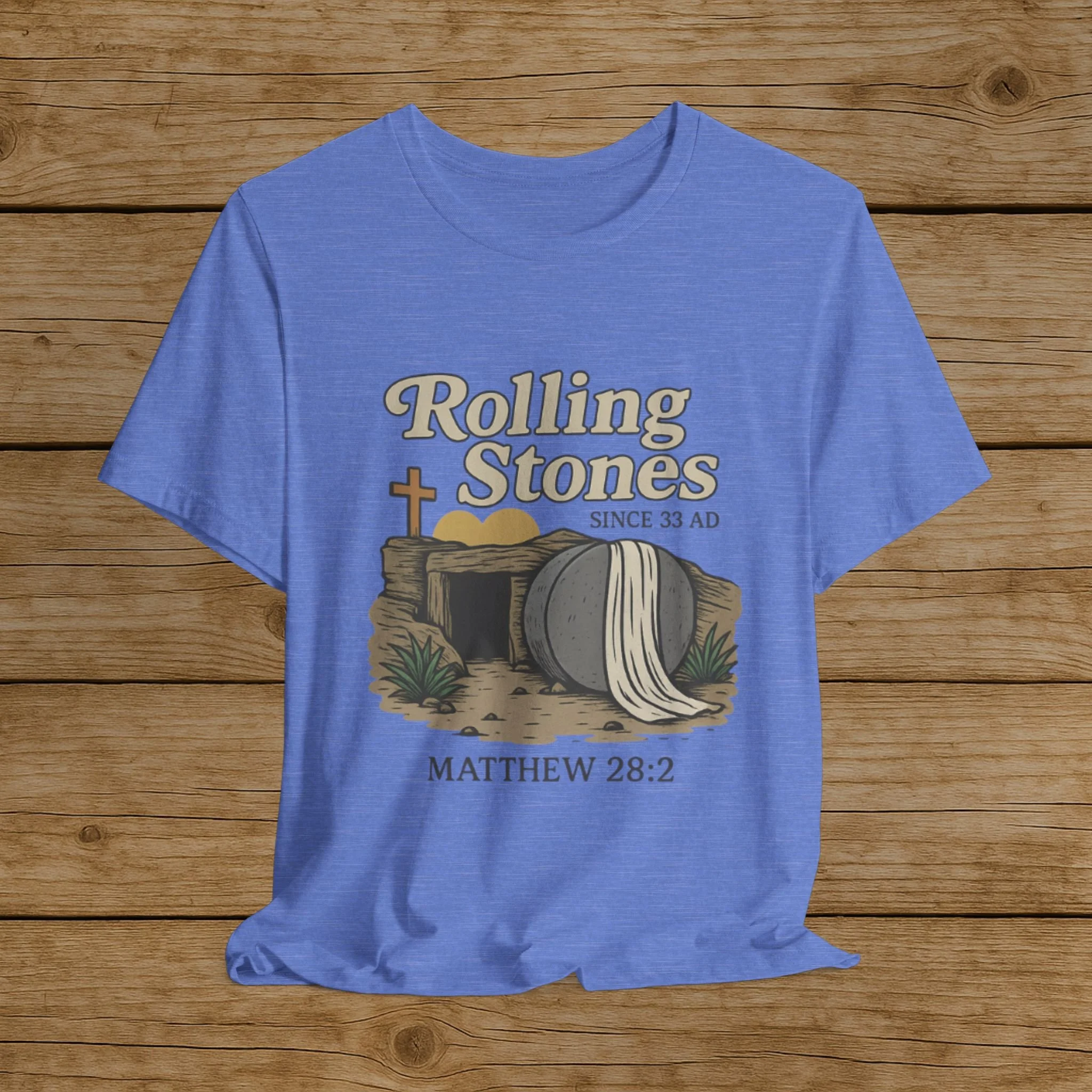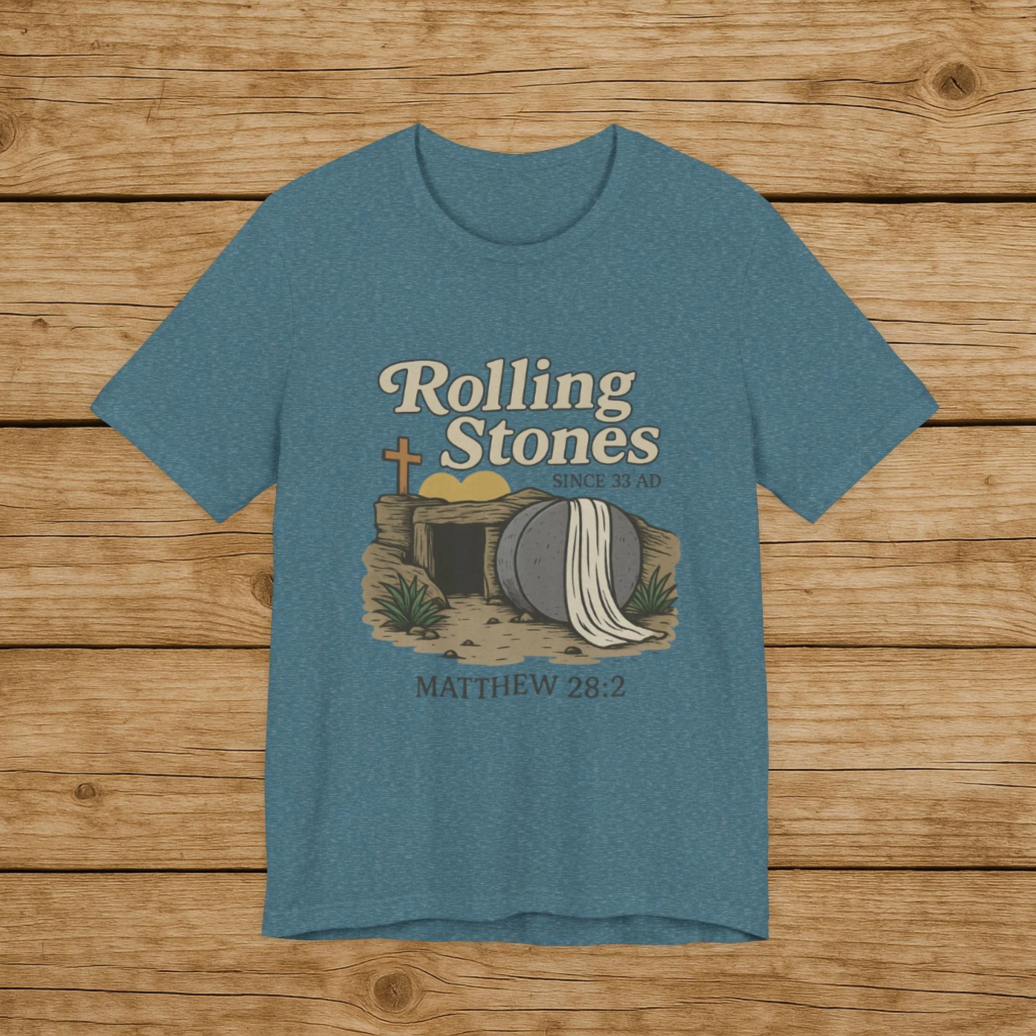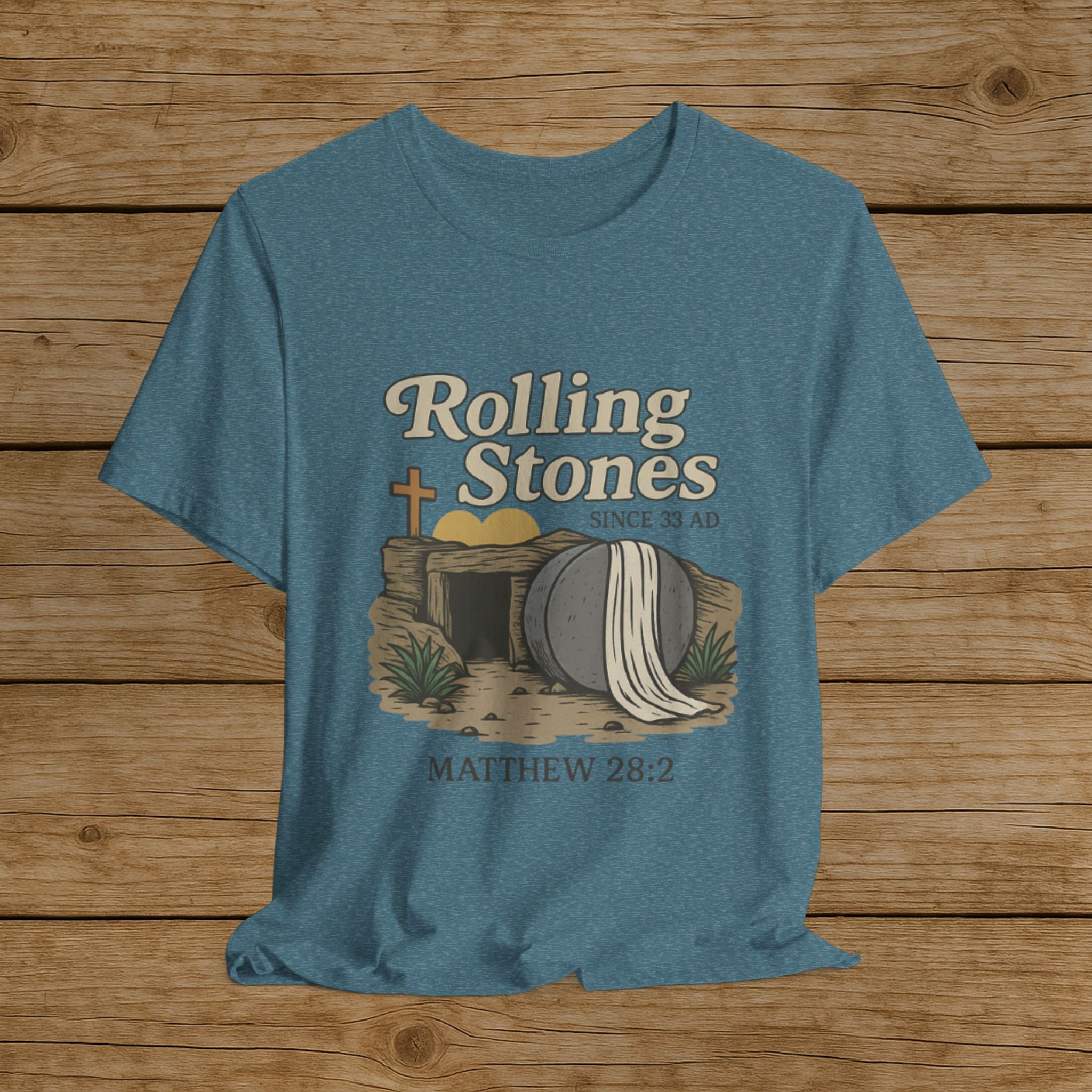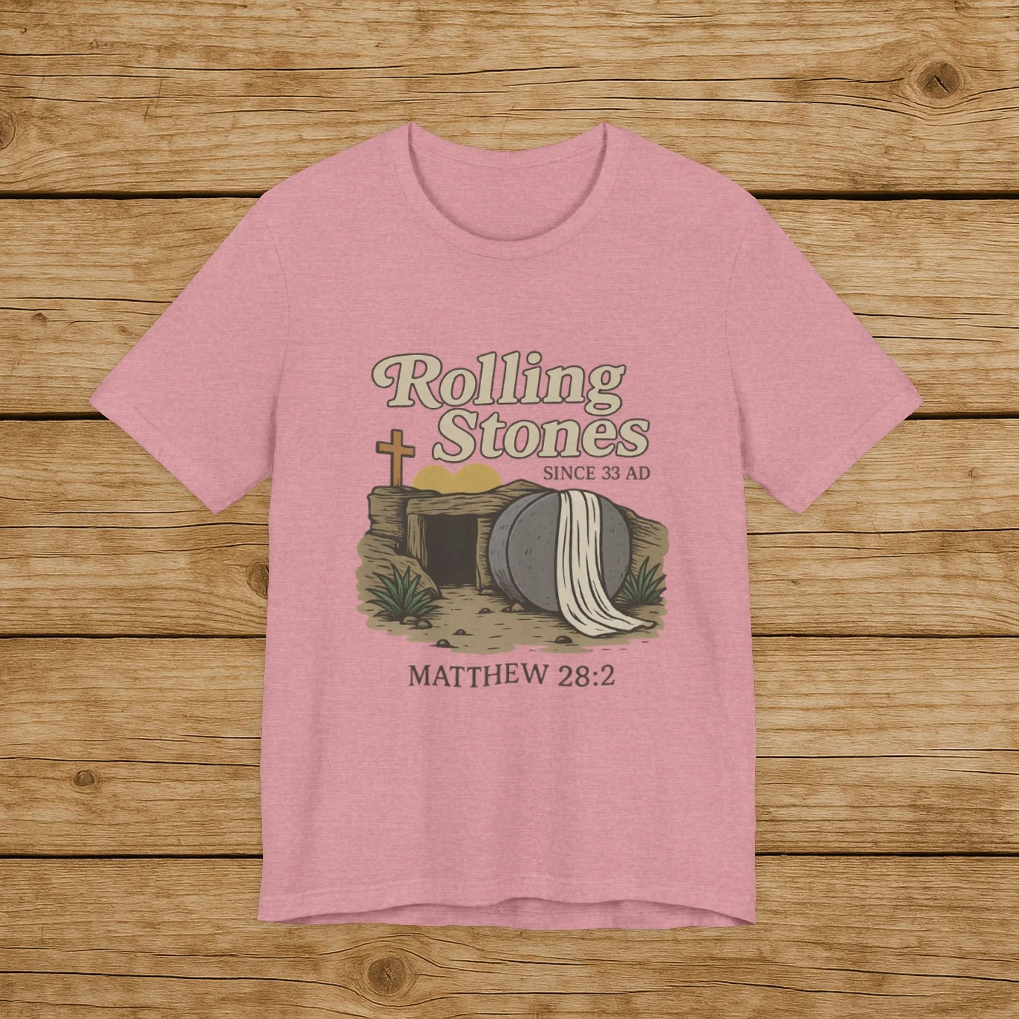 Celebrate the message of the Resurrection with this Rolling Stones Christian shirt inspired by Matthew 28:2. Featuring the empty tomb and the stone rolled away, this faith-based design is a powerful reminder of the moment that changed history.