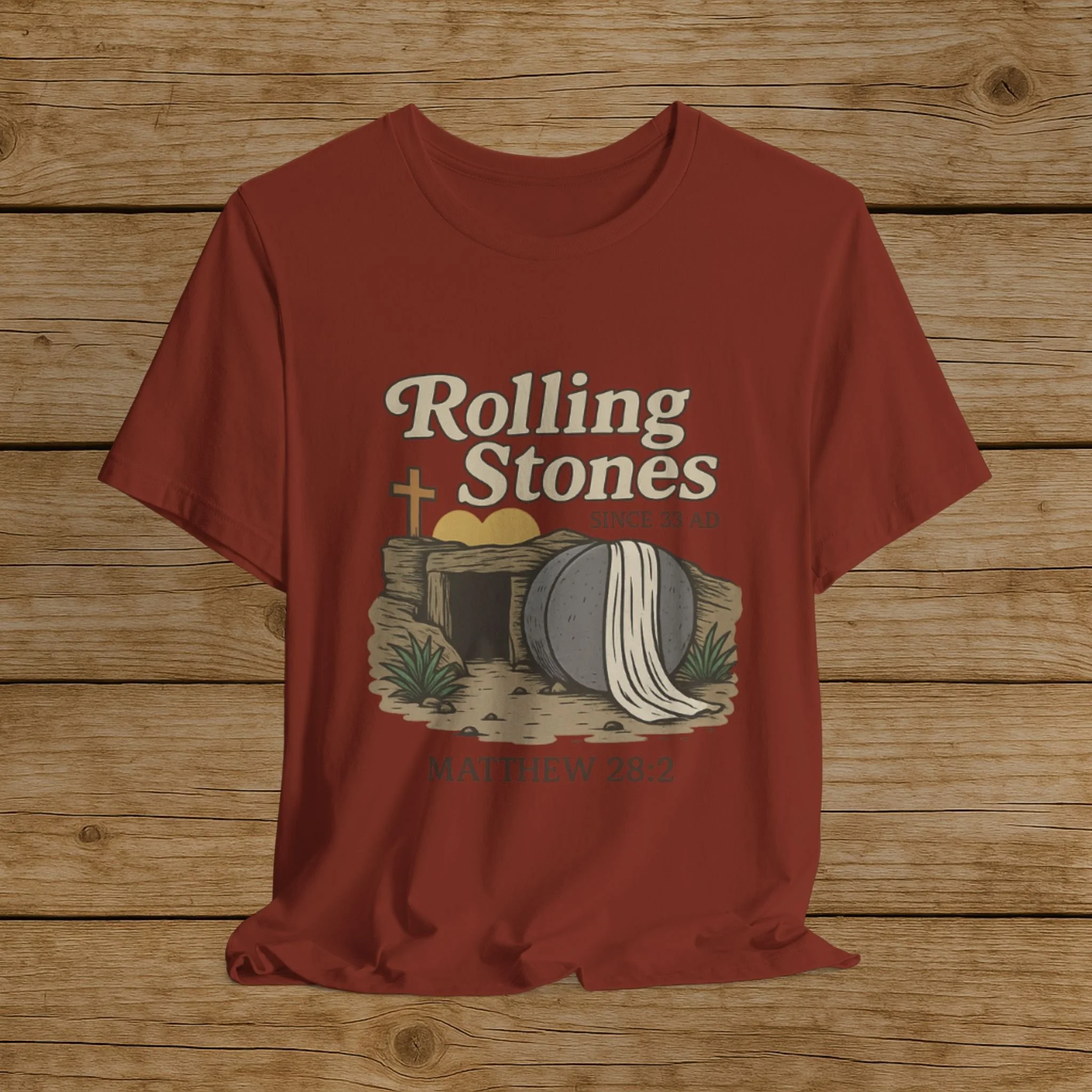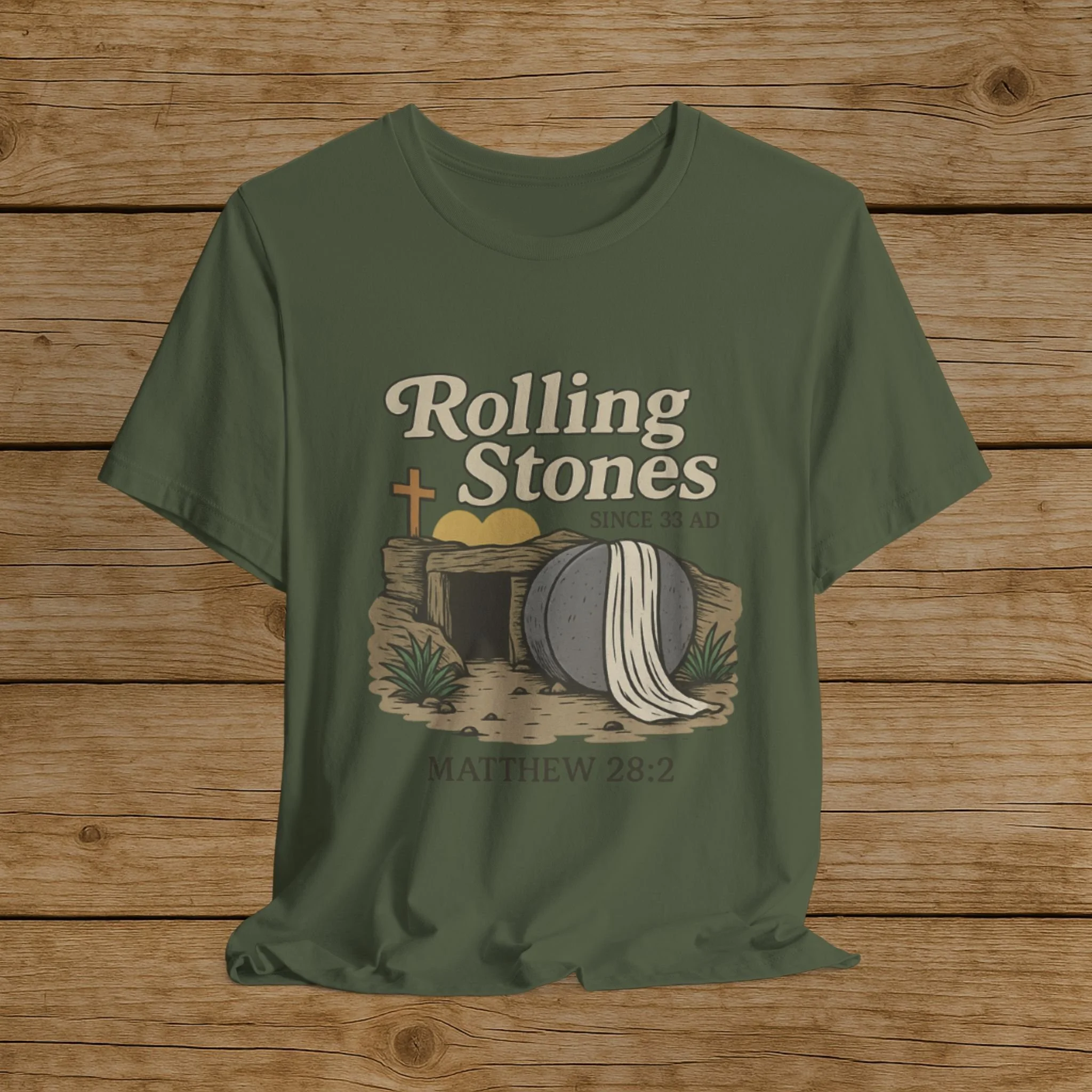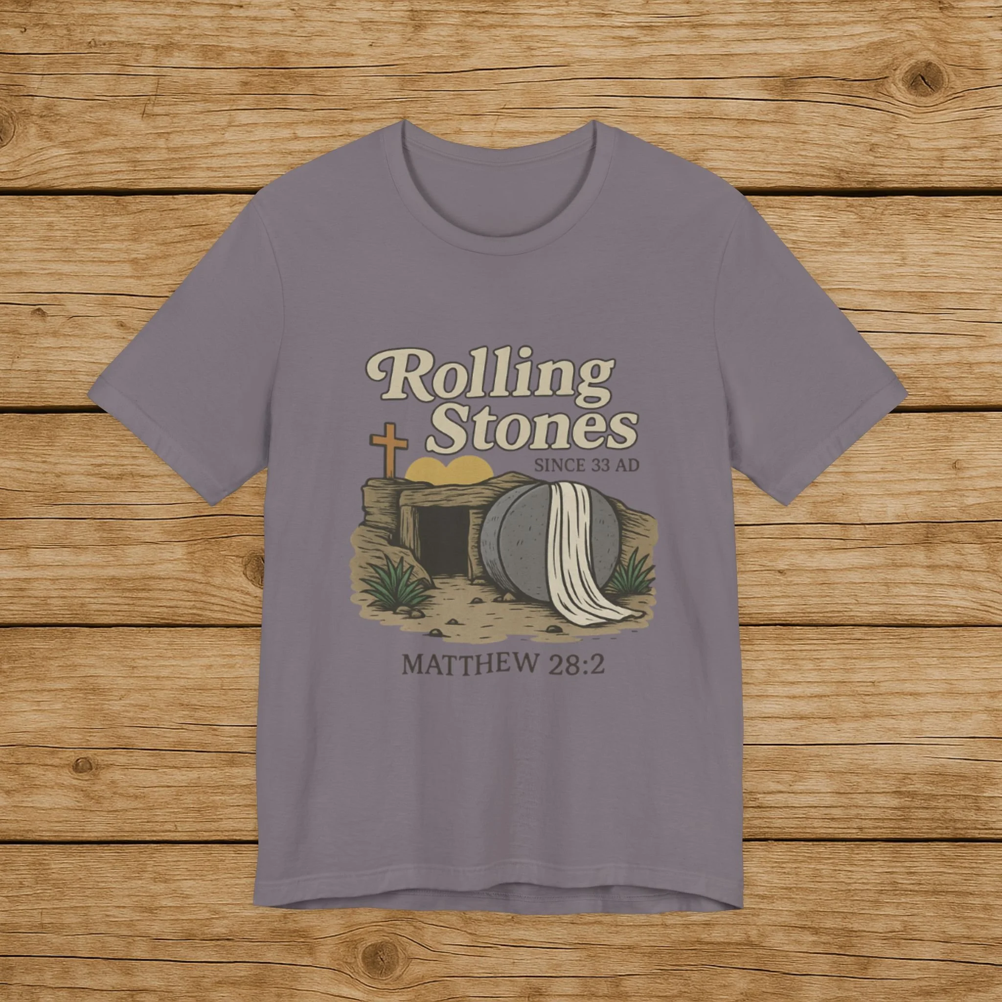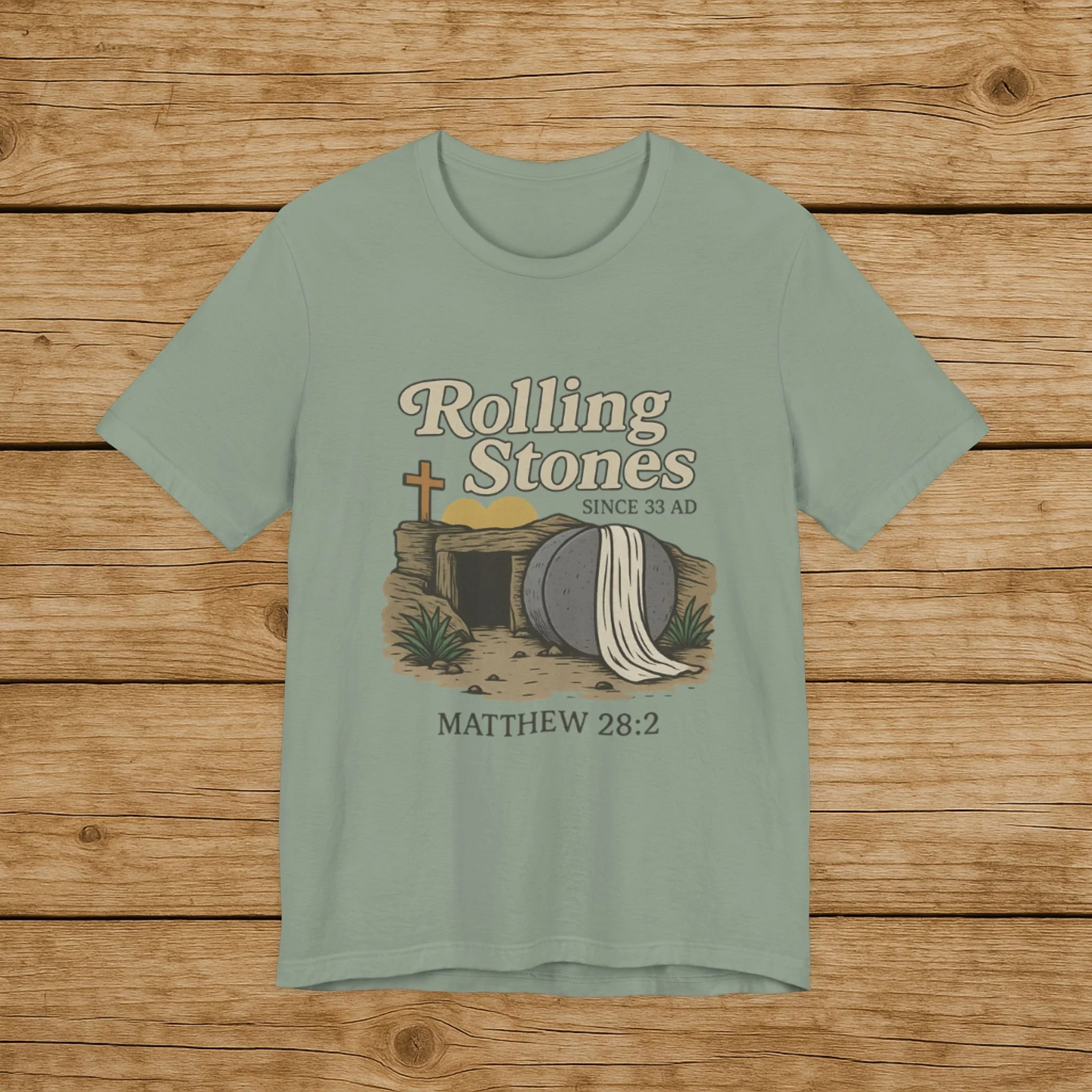 Celebrate the message of the Resurrection with this Rolling Stones Christian shirt inspired by Matthew 28:2. Featuring the empty tomb and the stone rolled away, this faith-based design is a powerful reminder of the moment that changed history.