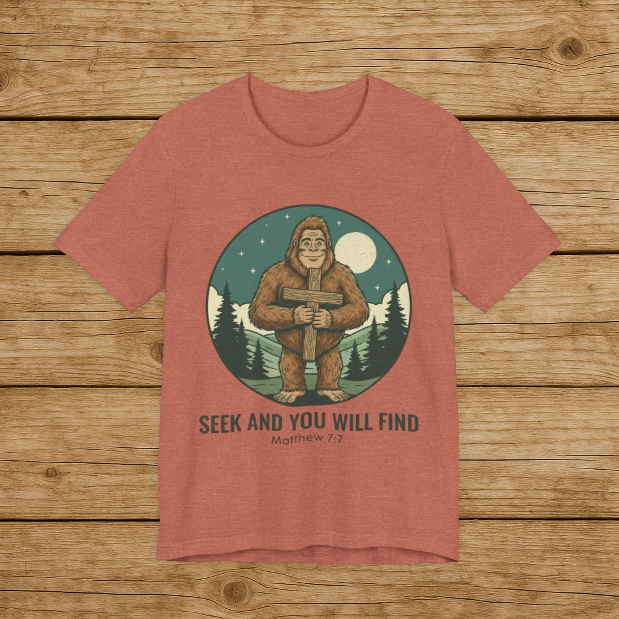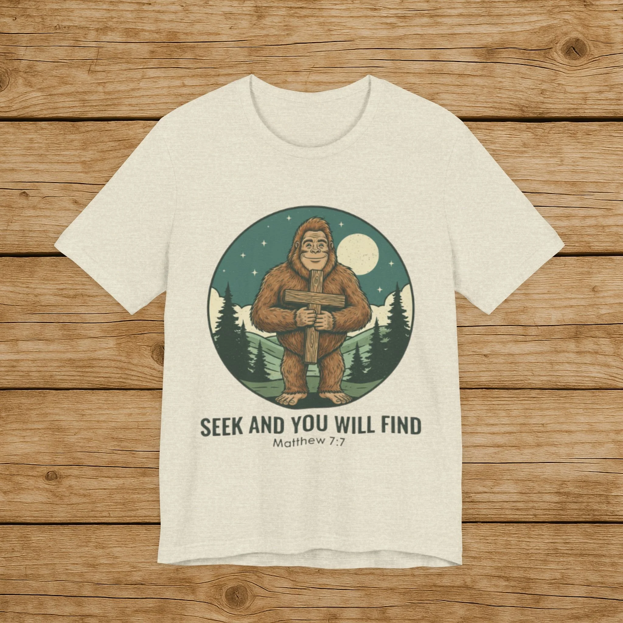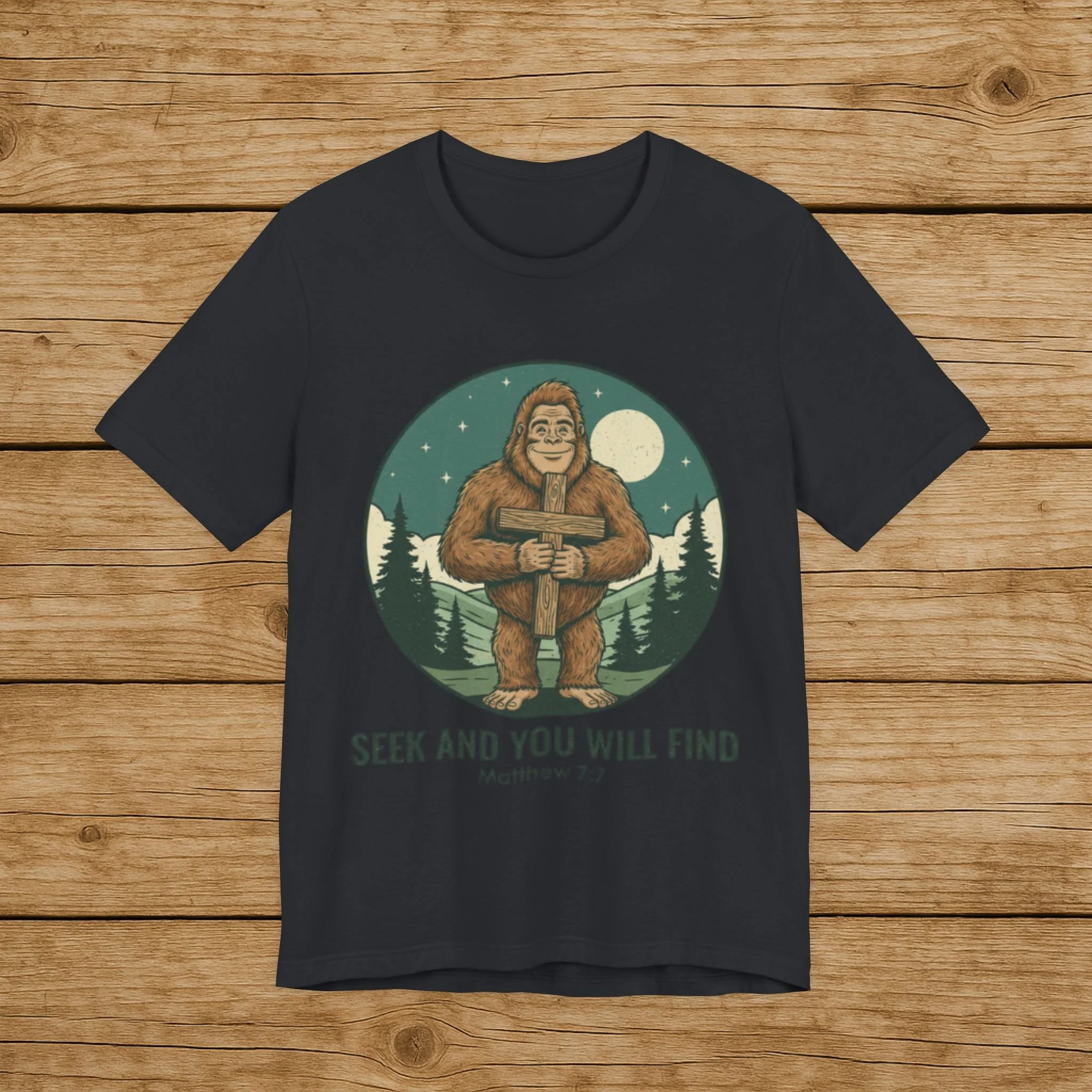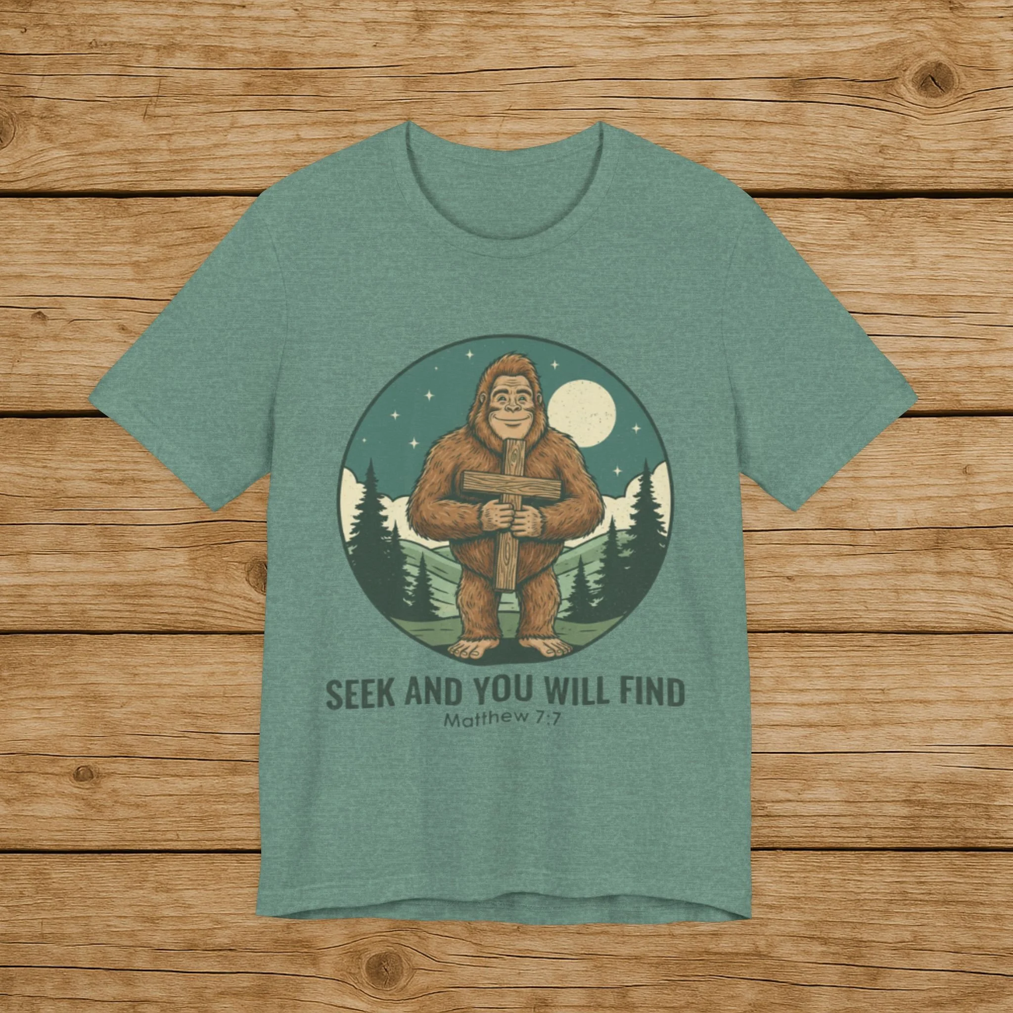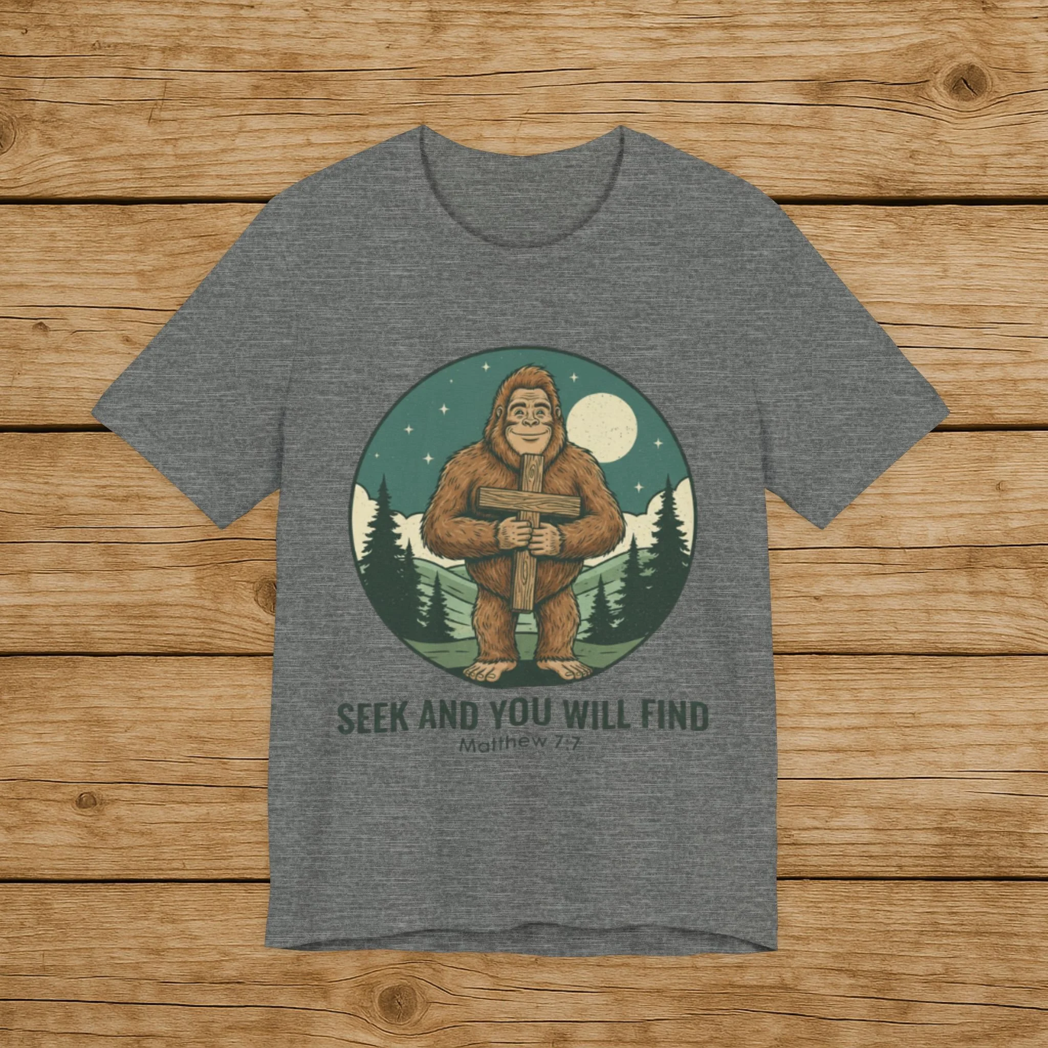 Seek and You Will Find Shirt — Bigfoot Christian Shirt, Matthew 7:7 Bible Verse Tee, Outdoors Faith Shirt, Sasquatch Hiking Shirt, Gospel Apparel